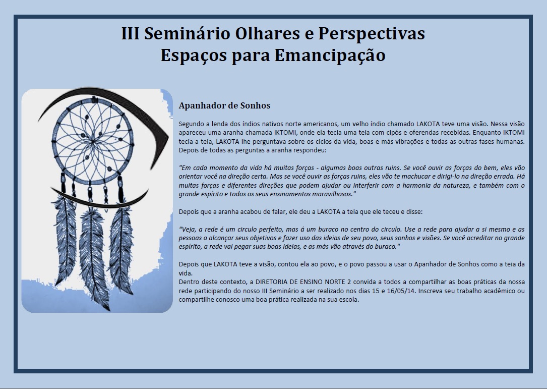 As incrições para apresentação de trabalhos no III Seminário da D.E. Norte 2 estão abertas. O objetivo desse Seminário continua o mesmo dos anos anterios, ou seja, o objetivo é integrar os diversos processos de formação continuada oferecidos nessa D.E., propiciando visibilidade e voz aos educadores, por meio da exposição de suas produções acadêmicas e práticas de sucesso. O participante terá efetivo exercício, caso a participação do mesmo seja no horário de trabalho. As Inscrições para a exposição de trabalhos estão abertas a partir do dia 14/03/14 e se encerram no dia 11/04/14.Para inscrever seu trabalho e envie o formulário. Inscrições encerradas